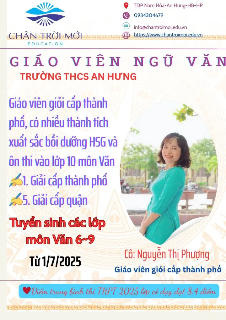 Trân trọng chào mừng cô Nguyễn Thị Phượng-giáo viên giỏi cấp thành phố môn ngữ văn, hiện đang công tác tại trường THCS An Hưng tham gia giảng dạy tại Chân Trời mới-Education!