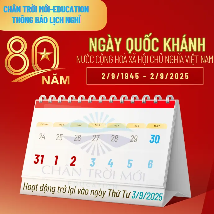 Trân trọng thông báo đến quý phụ huynh và các em học sinh lịch nghỉ lễ từ Chủ nhật 31/8 đến hết thứ 2 ngày 2/9.